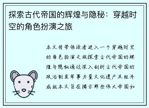 《山海经异兽录之奇幻秘境探秘与神话传奇再现》这篇文章,旨在深入探讨《山海经》中所记录的异兽、神话以及奇幻秘境的内涵与魅力。文章将从四个方面详细阐述《山海经》中的异兽种类、神话传说、奇幻秘境的背景,以及如何通过现代视角再现这些古老的传奇。首先,我们将介绍《山海经》的历史背景和其在中国文化中的重要性,然...